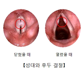 목에는 음식물이 지나가는 식도와 공기가 지나가는 기도가 함께 있습니다. 기도의 상부에 후두가 있어 하부 기도를 보호하는 역할을 하는데, 이 후두 안에는 성대가 있어 성대가 움직여 성문을 열고 닫음으로써 호흡과 발성을 할 수 있게 됩니다.