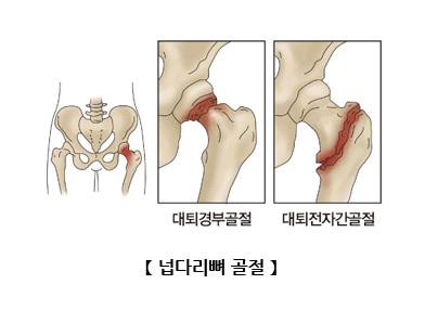 넙다리뼈의 몸통은 단단한 겉질뼈(피질골)로 둘러싸여 있으나 안에는 해면골이 거의 없어 긴 파이프와 같이 속이 빈 형태입니다. 넙다리뼈의 양측 말단부는 해면골이 있어 골절이 생기면 수월하게 다시 유합되지만 넙다리뼈의 몸통에는 해면골이 거의 없어 골절 시 뼈가 잘 붙지 않습니다. 특히 말단의 큰돌기(대전자부)는 넙다리뼈목(대퇴경부) 아래에 위치하여 목부위에 풍부한 혈액을 공급하는데, 이 부위의 혈액 공급이 원활하지 못하게 되면 대퇴골두 무혈관성 괴사가 발생하게 됩니다.