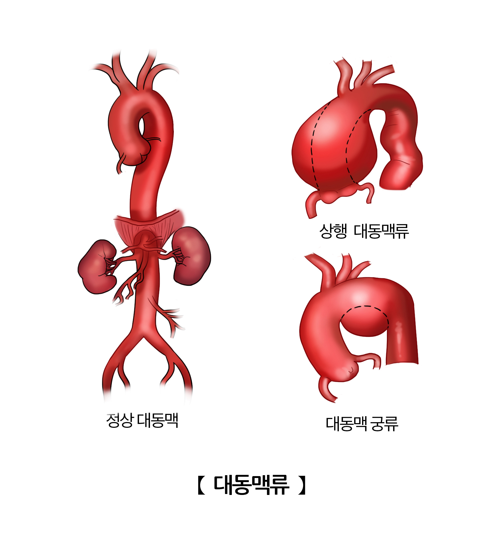동맥류는 동맥의 어느 부위가 국소적으로 늘어난 질환입니다. 동맥벽의 약화가 변화를 유발하는데, 대부분의 경우 노화와 관계되며 동맥경화증과 밀접한 관계를 갖고 있습니다. 대동맥류는 주로 복부대동맥에 발생하는데, 복부대동맥은 배 뒤편의 후복강이라는 비교적 넓은 공간에 위치하여 동맥류가 어른 주먹만큼 커질 때까지도 특별한 증상이 없는 경우가 많습니다. 흔히 이 질환을 풍선을 부는 것으로 비유하곤 하는데, 어느 순간이 지나면 터져 버리기 때문입니다. 물이 흐르는 수도관이 터지면 물바다가 되듯이 복부대동맥에 생긴 동맥류가 터지면 배 안은 피바다가 되어 사망에까지 이를 수 있습니다.
