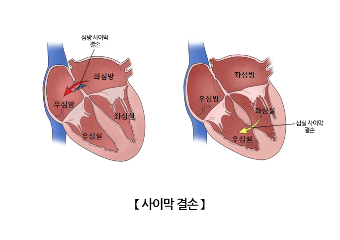 만약 심장의 중격 부위에 결손이 생기면 심방이나 심실의 혈액이 교류하므로 순차적인 혈액의 순환이 어려워집니다. 또한 심방이나 심실의 결손이 발생한 경우 정맥혈과 동맥혈이 뒤섞여 산소가 충분하지 못한 혈액이 전신으로 운반되므로 전신의 장기 및 조직이 기능하는데 어려움이 있을 수 있습니다. 중격에 결손이 생길 경우 결손의 크기에 따라 증상이 달라질 수 있으며, 자연적으로 닫히는 경우도 있으나 수술을 통해 치료가 필요할 수 있습니다.