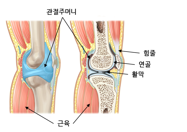 무릎은 뼈, 인대, 근육 등으로 구성되어 있습니다.