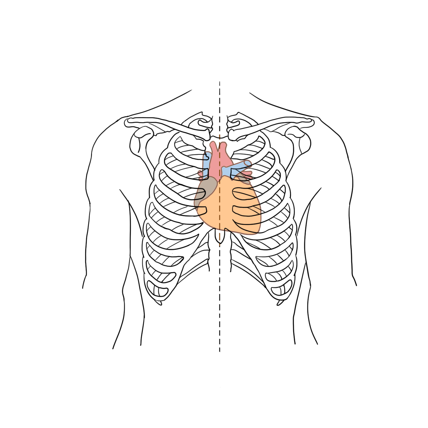 위치가슴의 왼쪽에 위치하며 흉골을 기준으로 왼쪽으로 2/3, 오른쪽으로 1/3이 위치하게 됩니다.