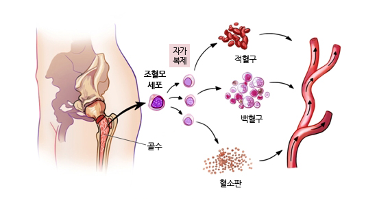 조혈모세포는 적혈구, 백혈구, 혈소판을 생산합니다. 조혈모세포는 자가복제능력이 있어 지속적인 조혈작용이 가능합니다.