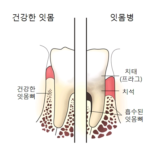 치아 뿌리를 둘러싸고 있는 부위로 잇몸이라고 합니다.