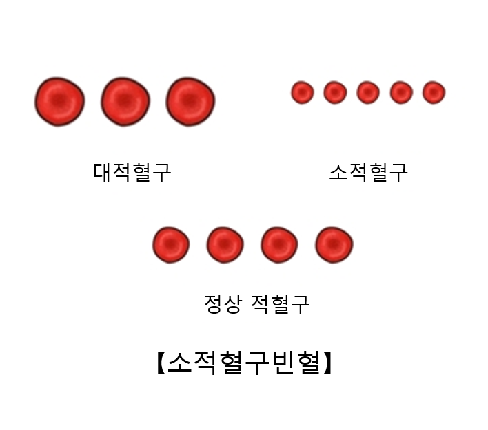 적혈구 크기가 정상 크기에 비해 커진 것을 대적혈구빈혈, 작아진 것을 소적혈구빈혈이라고 합니다. 소적혈구빈혈은 골수의 적혈구 전구 세포에 운반되는 철분의 양이 부족한 철결핍성 상태 또는 염증 반응에 의한 운반의 장애에 의해 발생합니다. 철분의 양이 정상이어도 헴(heme) 합성에 필요한 효소의 작용이 억제되는 철적모구빈혈이나, globin chain 합성 장애가 있는 각종 지중해 빈혈(thalassemia) 증후군에서도 소적혈구빈혈이 나타납니다. 즉, 철결핍빈혈, 만성 질환의 빈혈, 납중독, 철적모구빈혈, 지중해 빈혈이 소적혈구빈혈에 속합니다.