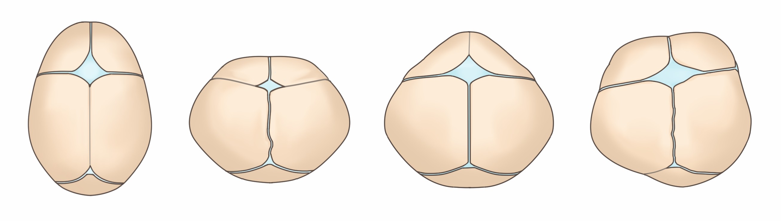 조기 유합이 일어나는 봉합선의 위치에 따라 다양한 양상이 나타납니다. 이마가 삼각형 모양을 이루는 삼각두, 앞뒤 짱구로 폭이 좁고 앞뒤로 머리가 길어지는 주상두, 한쪽 이마가 튀어나오고 눈이 아래로 밀려나는 사두증, 머리의 앞뒤 길이가 짧고 좌우 폭이 넓어지는 단두, 머리 모양이 탑처럼 높은 첨두증, 클로버 잎 모양 등이 있습니다. 여러 봉합선이 침범되었거나 증후군인 경우에는 얼굴 중앙 부분과 코가 납작하고 눈이 튀어나와 개구리 같은 모습을 보이기도 합니다.