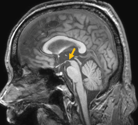 [진행핵상마비 환자의 뇌자기공명영상에서 확인되는 중뇌 위축 소견]