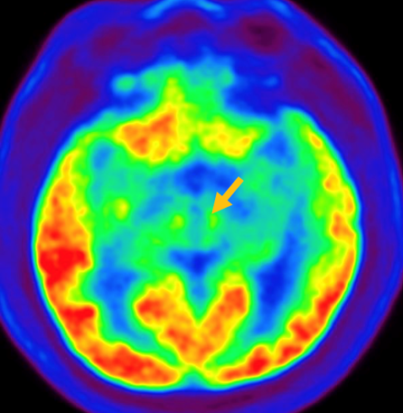 [진행핵상마비 환자의 뇌포도당 양전자 단층 촬영에서 확인되는 중뇌의 대사 저하 소견]
