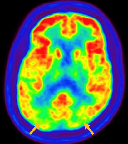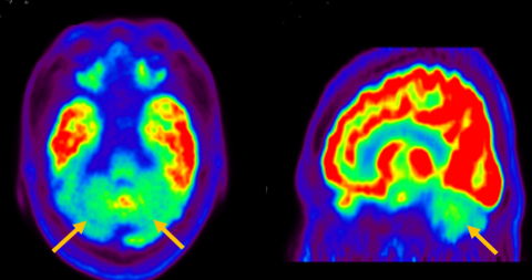 루이소체 치매는 파킨슨 증상 발생 초기나 그 이전부터 빠르게 진행되는 인지 기능 저하가 동반되는 질병입니다. 퇴행성 치매의 원인 중 두 번째로 많습니다. 반복되는 환시 증상과 인지, 의식 및 집중력의 변동이 특징적으로 나타납니다. 뇌 자기공명영상(MRI)에서 전반적인 대뇌 위축이 나타나며, 알츠하이머병에 비해 상대적으로 후두엽, 내측 측두엽이 보존되는 모습이 관찰됩니다. 뇌포도당 양전자 단층촬영(PET)을 시행하면 쐐기소엽(cuneus) 및 쐐기앞소엽(precuneus)의 대사가 감소한 상태가 확인됩니다. 그러나 뒤띠이랑(posterior cingulate gyrus)은 상대적으로 보존된 모습을 볼 수 있습니다.