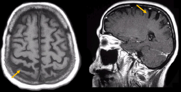 [피질기저핵 변성 환자의 뇌자기공명영상에서 확인되는 비대칭 뇌피질의 소견]