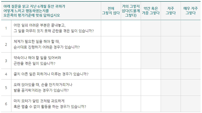 성인 ADHD를 진단할 때 쉽게 사용할 수 있는 '성인 ADHD 자가보고척도(ASRS)'가 있습니다. 선별 질문에서 검게 칠한 부분에 체크한 문항이 4개 이상이면 추가적인 검사가 필요합니다.