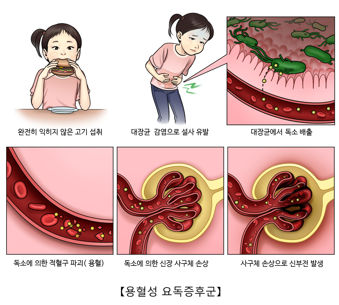 용혈성 요독 증후군은 4세 이하 영유아나 고령의 환자에게 급성 신부전을 일으키는 질환입니다. 이 질환의 특징은 미세혈관 병성 용혈성 빈혈과 혈소판 감소증입니다. 설사가 동반되는 유형을 전형적(설사 연관형) 용혈 요독 증후군으로, 그 외 다른 유형을 비전형적(설사 무관형) 용혈 요독 증후군으로 구분합니다. 미국의 어린이들이 대장균(O-157:H7)에 오염된 덜 익은 패티가 든 햄버거를 먹은 후 집단으로 이 병에 걸려서 '햄버거병'이라고 불립니다.
