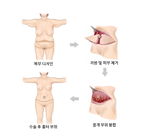 나이가 들어 피부가 늘어지고 복부 근육이 약해진 경우나, 급격히 많은 체중이 감소하여 피부가 처진 경우에는 지방 흡입을 하더라도 피부 표면이 고르지 않고 늘어진 피부가 남아 돌아 주름이 잡힐 수 있습니다. 이러한 경우에는 복부 근육을 조여주고 피부를 절제하는 수술을 통하여 좋은 결과를 얻을 수 있습니다. 이러한 수술은 전신 마취가 필요하며 2~3주 정도의 회복 기간이 필요합니다. 수술 후에는 팬티 라인 아래로 가느다란 흉터가 남습니다. 처음에는 흉터가 붉고 눈에 띄지만 시간이 지나며 흐려집니다.