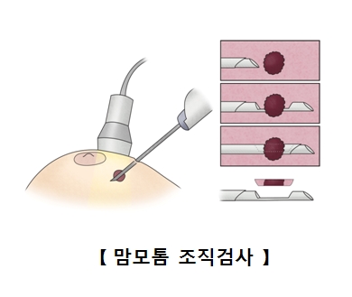 침, 맘모톰 등의 기구를 이용해 조직을 채취하여 조직검사를 시행합니다.