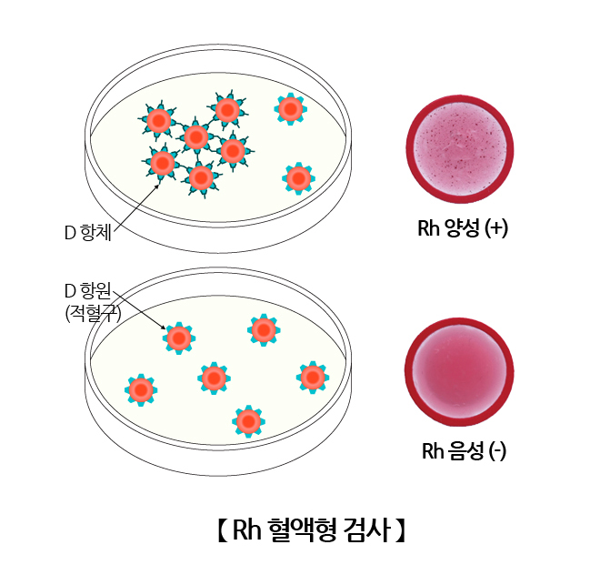Anti-D가 RhD 양성 적혈구와 만나면 육안으로 관찰 가능한 적혈구의 응집현상이 일어납니다. Rh 혈액형 검사는 이러한 적혈구의 응집반응을 원리로 이용하여 이루어집니다. Rh 혈액형 검사는 ABO 혈액형 검사와 달리 적혈구 표면에 D 항원이 존재하는지 확인하는 혈구형 검사만 시행하는데, 검사 대상자의 적혈구를 anti-D 시약과 반응을 시키고 응집이 일어나는지 관찰합니다.