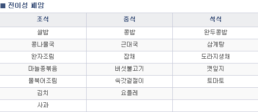 양질의 단백질 식품(살코기, 생선, 해물, 콩, 두부, 계란), 신선한 채소, 과일, 식물성 지방(견과류), 우유 및 유제품