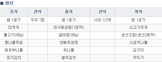 곡류(쌀밥, 잡곡밥, 감자, 고구마, 떡 등),육류(살코기), 어류(생선, 조개류 등), 두부, 콩, 달걀, 신선한 채소, 견과류(땅콩, 호두, 잣 등), 신선한 과일, 유제품(우유, 두유, 요구르트, 요거트, 저지방우유)