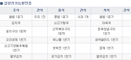 - 곡류 및 전분류 (쌀밥, 전곡, 잡곡밥, 국수, 떡, 식빵, 씨리얼, 감자, 고구마, 밤 등)