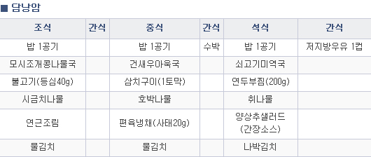 쌀밥, 잡곡밥, 살코기(쇠고기, 돼지고기), 껍질 벗긴 닭고기, 생선, 두부, 콩, 각종 야채, 저지방 우유 등