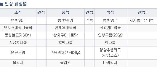 기름기 적은 살코기(돼지고기, 소고기), 닭고기(껍질 제거), 생선, 두부, 각종 야채 등