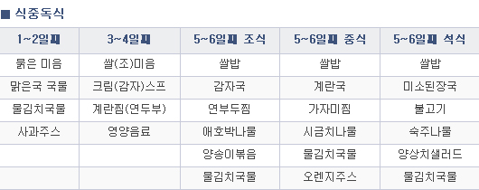회복기 - 쌀밥, 살코기, 계란 두부, 닭고기, 생선, 유제품, 잘 익힌 시금치, 애호박, 당근, 숙주, 양송이 가지, 양상치, 바나나, 과일통조림,