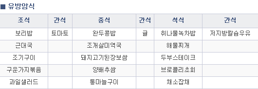 5. 식물성 기름(참기름, 들기름, 식용유, 올리브 등)은 한끼에 1-2 찻술 이하로 사용하며 조림, 찜, 무침 등의 조리방법을 주로 이용합니다.